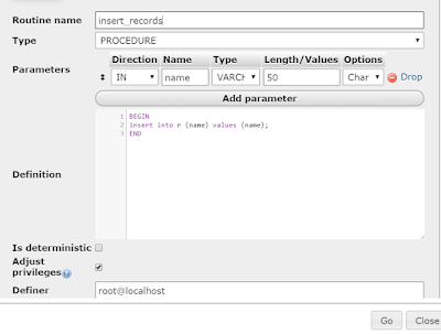 DELIMITER $$CREATE PROCEDURE `insert_records`(IN `name` VARCHAR(50))BEGINinsert into r (name) values (name);END$$DELIMITER ;